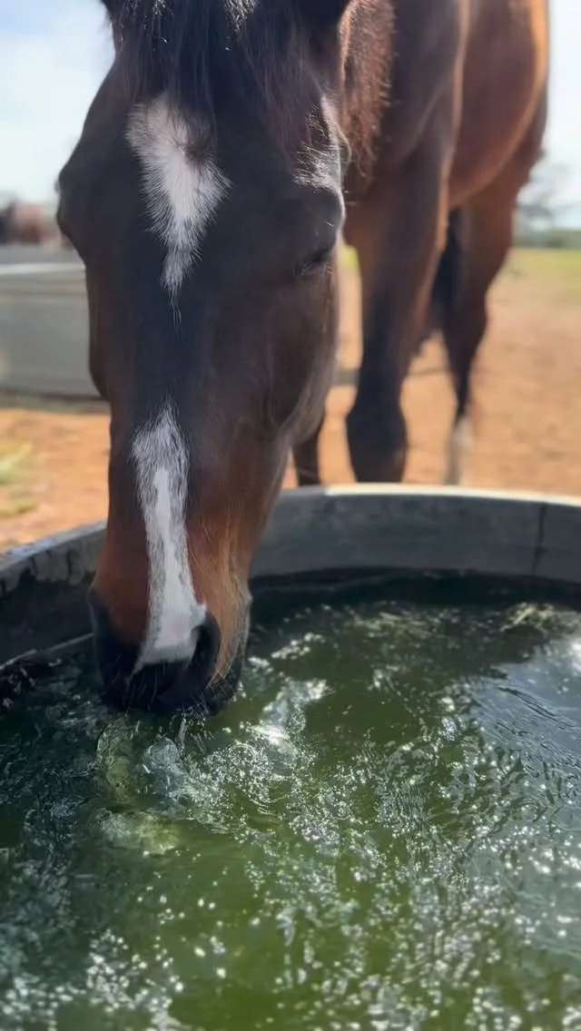 Gus, a calm therapy horse at HorseSpeak, standing near a water trough in the pasture with other horses in the background.